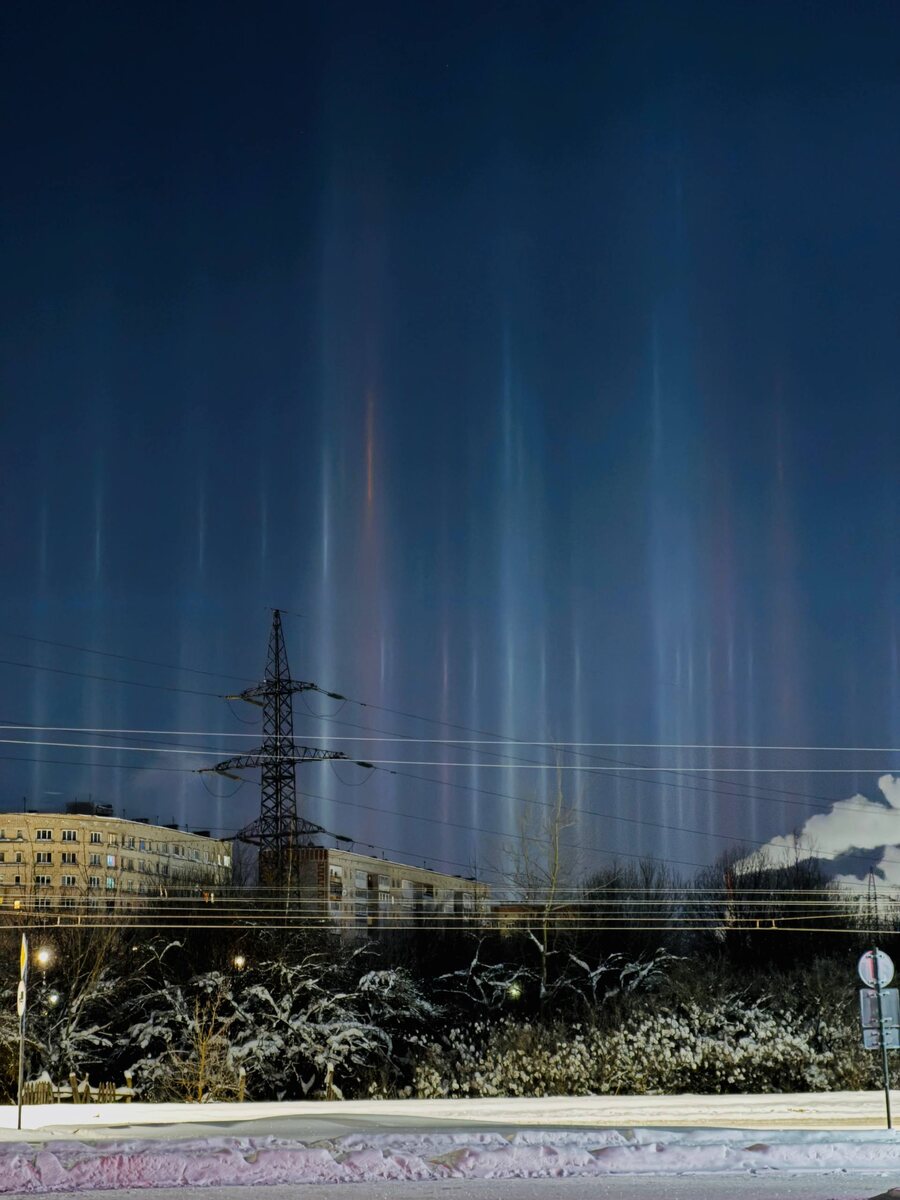 Одним морознымм вечером стал свидетелем того как над зимним Рыбинском разворачивается удивительное зрелище — в небе возникают световые столбы. Они выглядят как вертикальные лучи света, устремлённые ввысь, и придают привычному городскому пейзажу почти фантастический облик. Это природное явление рождается благодаря особому состоянию атмосферы: при сильном морозе воздух наполняется мельчайшими ледяными кристаллами. Эти кристаллики, словно миллионы крошечных зеркал, отражают и преломляют свет — но не солнечный, а искусственный: от уличных фонарей, фар автомобилей или окон домов. В результате над городом возникают сияющие колонны света, будто прожекторы неведомых небесных маяков. Особенно эффектно световые столбы смотрятся в ясные морозные вечера, когда небо безоблачно, а температура опускается значительно ниже нуля. В свете фонарей ледяные кристаллы переливаются разными оттенками — от тёплого золотистого до холодно‑голубого, создавая игру света и тени. Тени от зданий и деревьев причудливо
