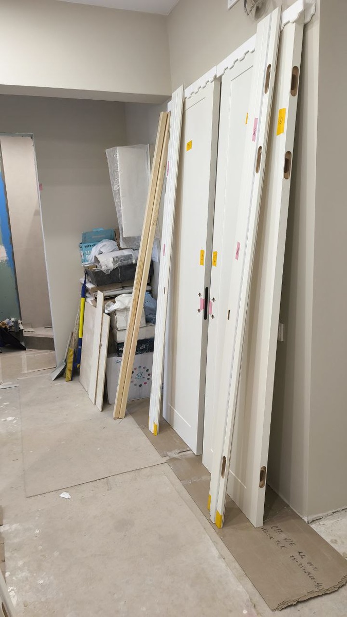 Выезд на монтаж начался многообещающе, но при распаковке наличников и доборов обнаружили брак. Составили рекламацию, короба отправили под замену. Я уточнила, могут ли они поставить хотя бы одну дверь сейчас. Мне ответили, что ВСЕ доборы, короба и нальчники бракованные (хорошо сами дверные полотна — хорошего качества). Так как я с этим подрядчиком уже давно, на объект приезжал представитель фабрики ЛИЧНО, оценил масштаб проблемы: оказалось, испорчена не вся партия, и в тот день мастера могли установить аж три двери. 😈 Позже нам прислали другого сборщика (спойлер: он всё сделал аккуратно и по делу). 😧НО он полдня раскладывал инструменты и часто уходил курить — в итоге ставил пять дверей пять дней. #КатяРаботает
