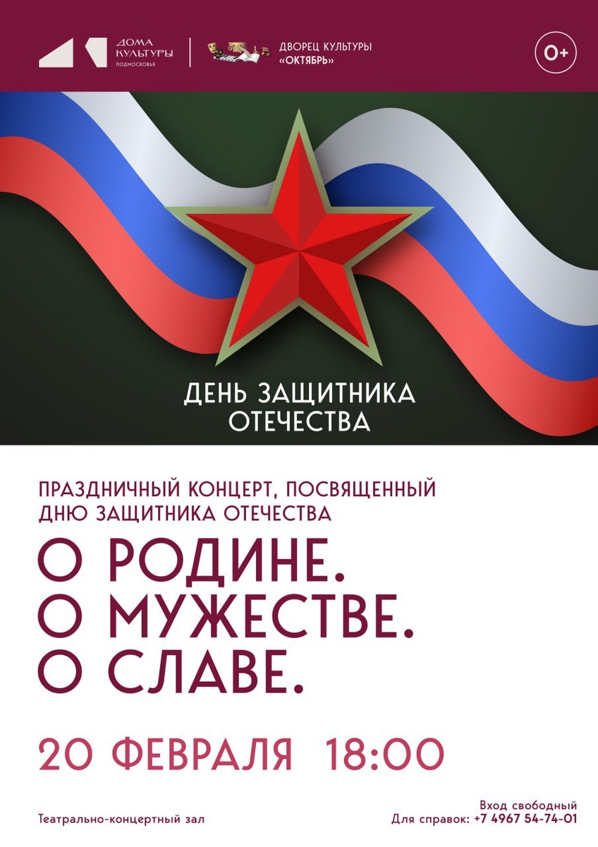 ✨ Праздничный концерт, посвященный Дню защитника отечества 🎶Праздничная программа подарит яркие эмоции и чувство гордости за нашу страну! 🚫 Возраст: 0+ 📆 20.02.2026 🕒 18:00 🏢 Дворец культуры «Октябрь» 📍 г. Подольск, ул. Свердлова, д.38 💰 Вход свободный❗️ ⭐Поддержать канал голосом 🍰Где поесть в Подольске ✅ Мероприятия Подольск https://dzen.ru/id/66ed500f7b5671493eca3fd6 http://vk.com/podolsk_events http://dzen.ru/podolsk_events