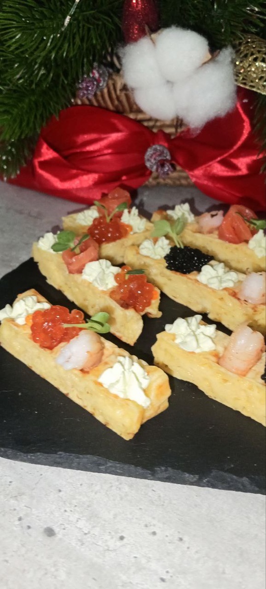 А готовится очень легко. Для теста: сыр тёртый 100 гр; яйцо 2 шт; молоко 100 гр; мука 100 гр; разрыхлитель 1/2 ч.л; соль Для начинки: творожный сыр; икра красная/палтуса/щуки; огурец; с/с рыбка; креветки; микрозелень. Соединить все ингредиенты для вафель и хорошо перемешать. Вафли можно сделать разноцветными, например для жёлтых - добавить куркуму, для зелёных - измельчённый шпинат. Испечь вафли в мультипекаре, слегка остудить и нарезать на полоски с ячейками (3 или 4 шт). В углубления выложить начинку чередуя. Творожный сыр отсадить кондитерским мешком с насадкой. Далее украсить по желанию рыбкой, креветками, икрой, микрозеленью. #закуски #бутерброд #вафли #брускета #бранч #фуршет В этом посте есть большое видео, которое не загрузилось в Дзен. Откройте оригинал поста в телеграме, чтобы его посмотреть