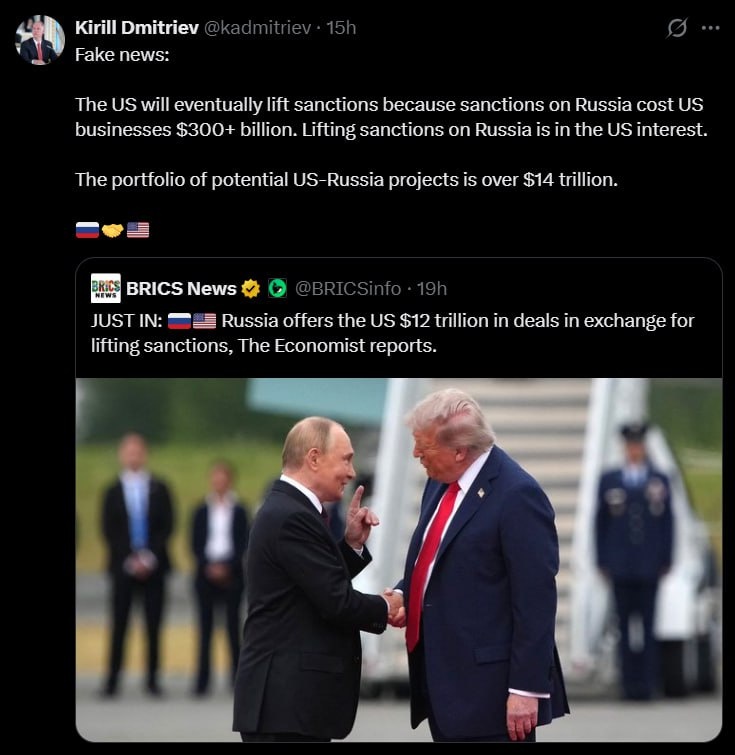 'Lifting sanctions on Russia is in the US interest' — Putin's envoy Dmitriev Russia offering $12 trillion to US is 'FAKE' 'The portfolio of potential US-Russia projects is OVER $14 TRILLION'