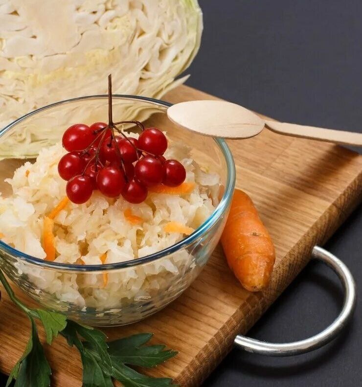 Знаете, иногда думаю: как это природа умудрилась создать продукт, который одновременно и лечит, и радует, и даже немного хулиганит (в смысле — пускает весёлые пузырьки в животе)? Речь, конечно, о квашеной капусте — скромной звезде зимних столов. Продукт простой, но сколько в нем пользы. Не зря наши предки ели его зимой. 🔘 *Витамин C — да‑да, тот самый, что в апельсинах, но без цитрусовых капризов, а содержания в продукте больше. 🔘 Пробиотики — эти маленькие бойцы живут в рассоле и готовы заселиться в ваш кишечник, чтобы наладить там порядок. 🔘 Квашеная капуста — ферментированный продукт, т.е организму не нужно тратить дополнительную энергию на переработку. 🔘 Клетчатка — мягко, но настойчиво помогает пищеварению. Никаких резких движений, только плавное продвижение всего лишнего к выходу. 🔘 Низкокалорийность — 23 ккал на 100 г! Можно есть много. Идеальный компромисс между «хочу вкусно» и «надо следить за фигурой». 🔘 Минералы — кальций, железо, магний… В общем, целый витаминно‑ми