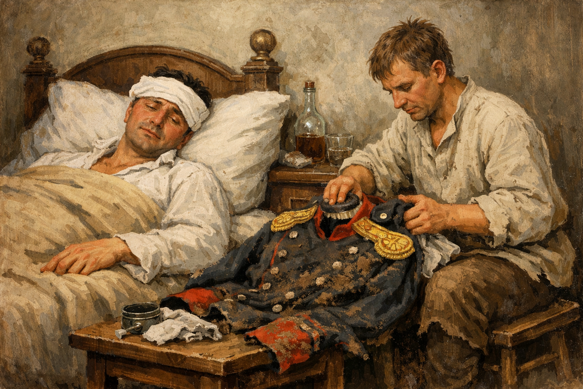 Поручик Ржевский просыпается после сильнейшей пьянки и видит, что денщик чистит его обблёванный китель.