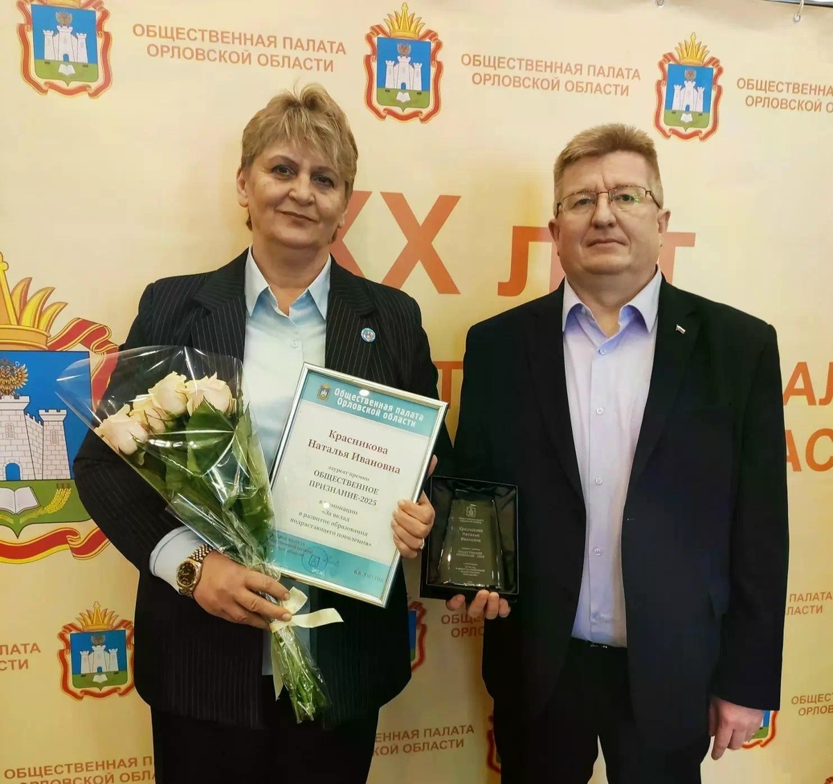 Директор мценской школы получила премию «Общественное признание» Директор школы № 3 города Мценска Наталья Красникова стала лауреатом областной премии «Общественное признание» в номинации «За вклад в развитие образования подрастающего поколения». - Этот почетный знак внимания — заслуженное признание 40‑летнего труда в сфере образования и 25 лет бессменного руководства школой, - рассказали в администрации города Мценска. - Наталья Ивановна также внесла значительный вклад в сохранение классических образовательных традиций. Помимо профессиональной деятельности, Наталья Красникова активно участвует в общественной жизни: избиралась депутатом Мценского городского Совета, возглавляет городскую общественную палату и входит в Совет руководителей образовательных организаций Орловской области. Ее профессионализм отмечен множеством наград, включая звание «Почетный работник общего образования Российской Федерации», нагрудный знак ФНПР «За заслуги перед профдвижением России» и знак Профсоюза рабо