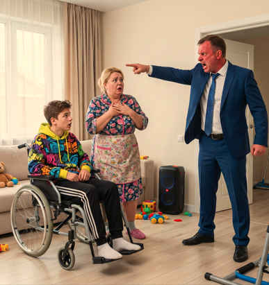 Нина вздрогнула всем своим грузным телом, споткнулась о край ковра и едва не выпустила мальчика из рук. Она побледнела, судорожно вцепилась в Дениса и максимально бережно, но торопливо опустила его обратно в кресло. Смех оборвался мгновенно, будто кто-то перерезал провод. Лицо подростка тут же осунулось, плечи сжались.