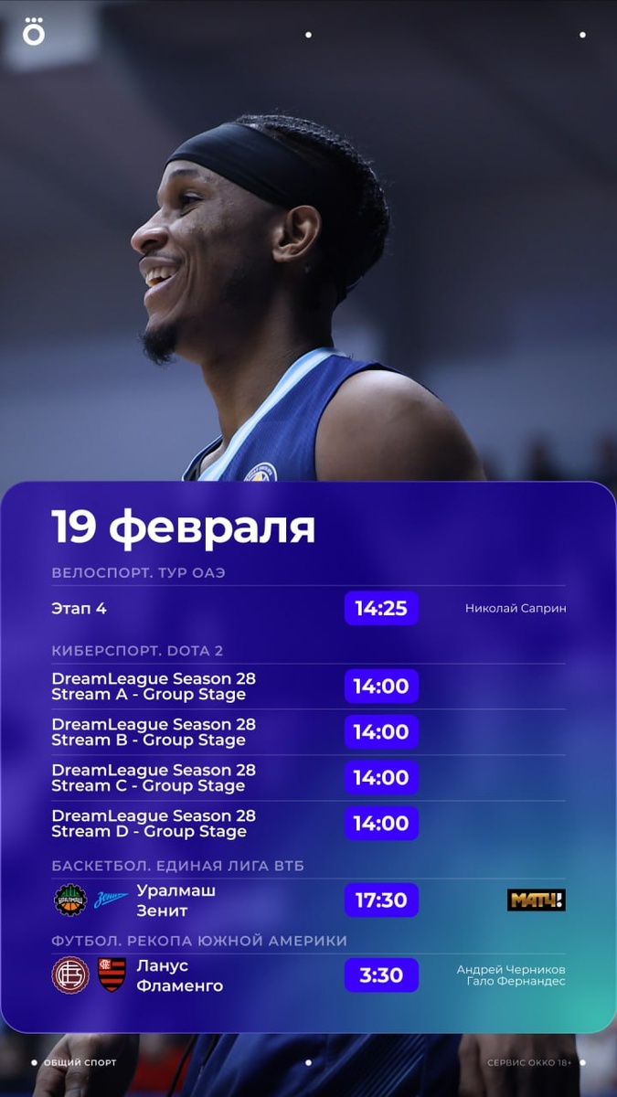 🍿 Сегодня путешествуем по разным точкам планеты. Смотрим велоспорт в ОАЭ, южноамериканский футбол и российский баскетбол. Киберспорт тоже не пропускаем: https://okko.tv/s/4ot
