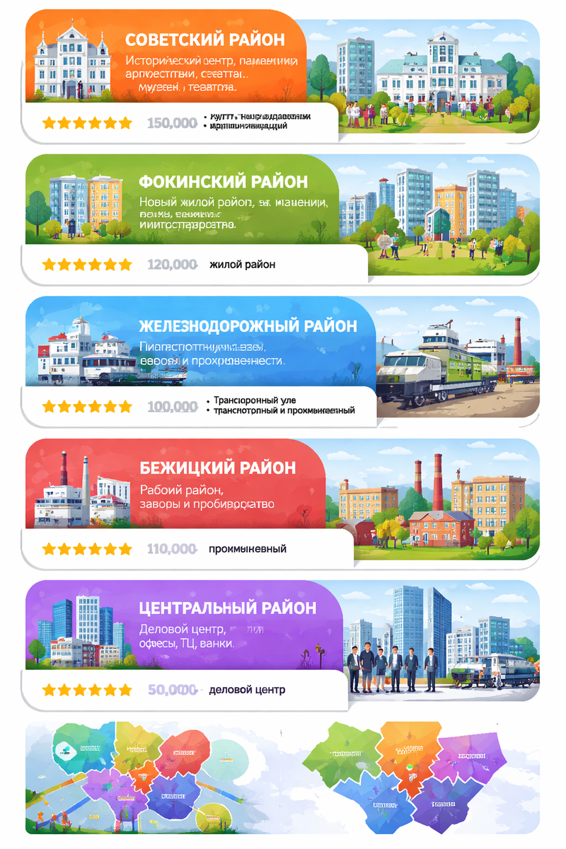 Выбирайте район под себя. Если любите жизнь — в Советский. Если хотите самодостаточности и истории — в Бежицу. Если бюджет ограничен — в Володарский. А Фокинский... ну, там цены действительно низкие.