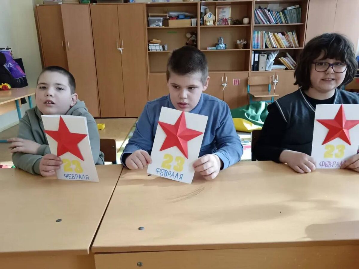 Сегодня 1Б класс изготовил красивые и трогательные открытки для пап и дедушек ко Дню защитника Отечества