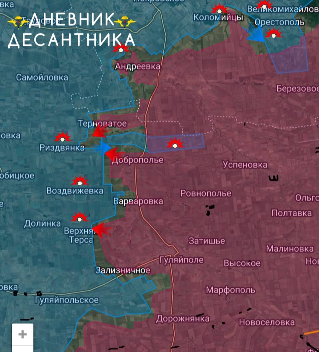 ▫️Участок Гуляйполя. ▫️Северо-западнее Гуляйполя наши войска отбили Криничное и продвинулись до ж/д полотна, а также вдоль него расширили территорию севернее и в направлении Верхней Терсы. ▫️Со стороны Доброполья, Прилук продвинулись к Воздвижевке и Риздвянке. ▫️В районе Отрадного, Орестополя, Косовцево, Новоалександровки, Речного и Алексеевки воздушная разведка ВС РФ продолжает выявлять и уничтожать дронами рассредоточившихся ранее ВСУшников, которые в попытке контрнаступа пытались закрепиться. 💥Нанесены удары в районах н.п. Александровка, Любицкое, западнее Риздвянки, юго-западнее Зализничное. Штурмовые группы противника трижды попытались атаковать на ряде участков: 💥95 одшбр на БМП дважды из н.п. Коломийцы — в южном и восточном направлениях; 💥5 ошбр на ББМ с запада — в направлении Риздвянка. ▫️Общие потери противника в зоне ответственности группировки войск "Восток" за сутки: 💥свыше 1 роты живой силы; 💥1 БТР; 💥свыше 15 ед. легкой техники. 📲 Дневник Десантника в МАХ