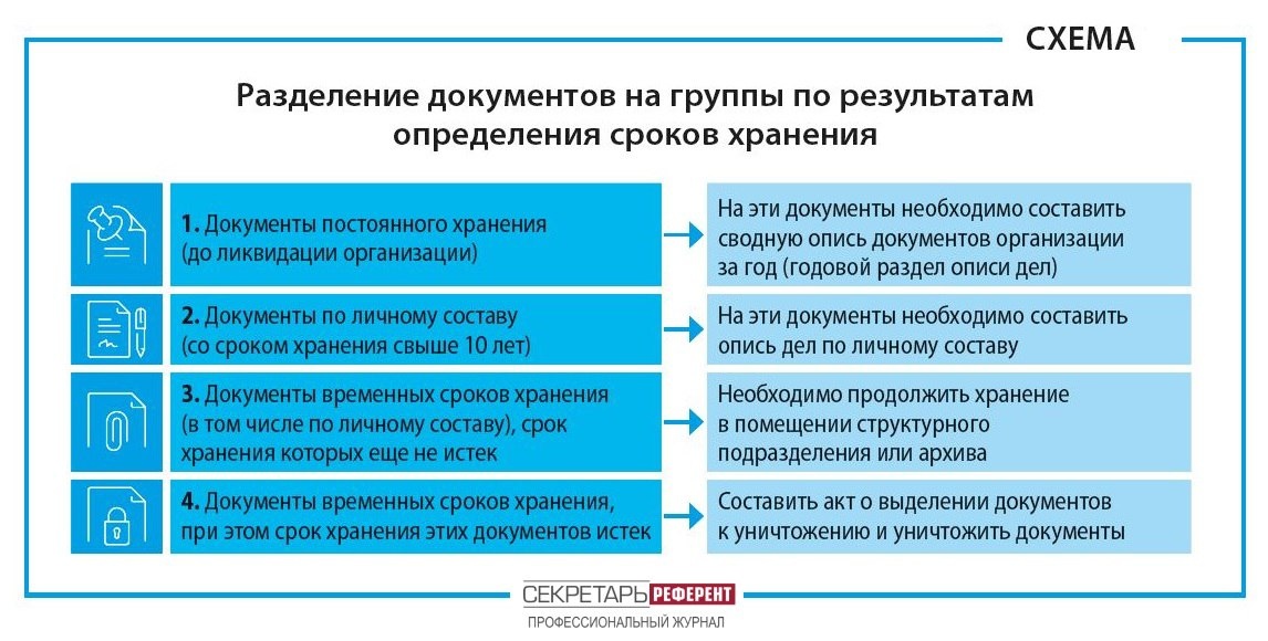 После определения сроков хранения документов распределите их по группам (Схема).