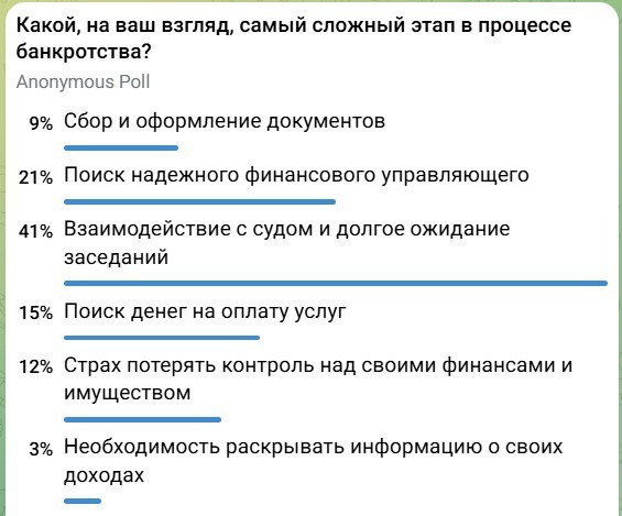 ❗ Сложность для тех, кто желает пройти процедуру или уже проходит процедуру выглядит следующим образом: 1️⃣Взаимодействие с судом и долгое ожидание заседаний 2️⃣Поиск надежного финансового управляющего 3️⃣Поиск денег на оплату услуг 4️⃣Страх потерять контроль над своими финансами и имуществом 5️⃣Сбор и оформление документов 6️⃣Необходимость раскрывать информацию о своих доходах Опрос проходили здесь Далее подробно опишу по каждому из этих пунктов нюансы и детали. Если Вы считаете, что есть другие сложности, то пишите прямо под этим постом, разберем каждый вопрос здесь же на всеобщем обозрении!