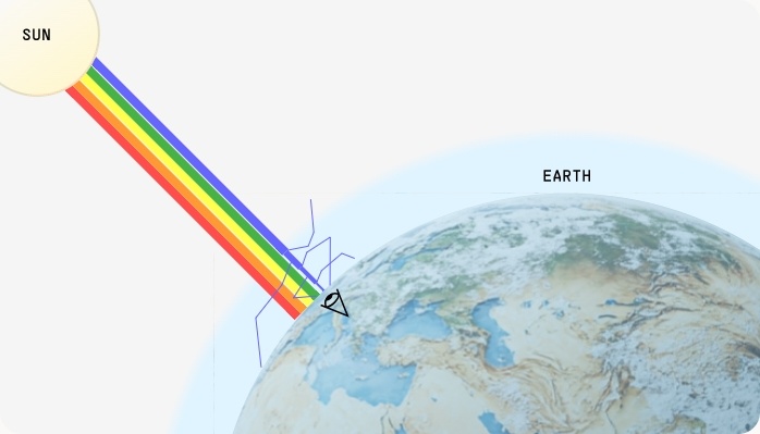 Когда солнечный свет попадает в атмосферу Земли, большинство цветов фотонов проходит без помех. Но синие фотоны склонны сильно рикошетить.