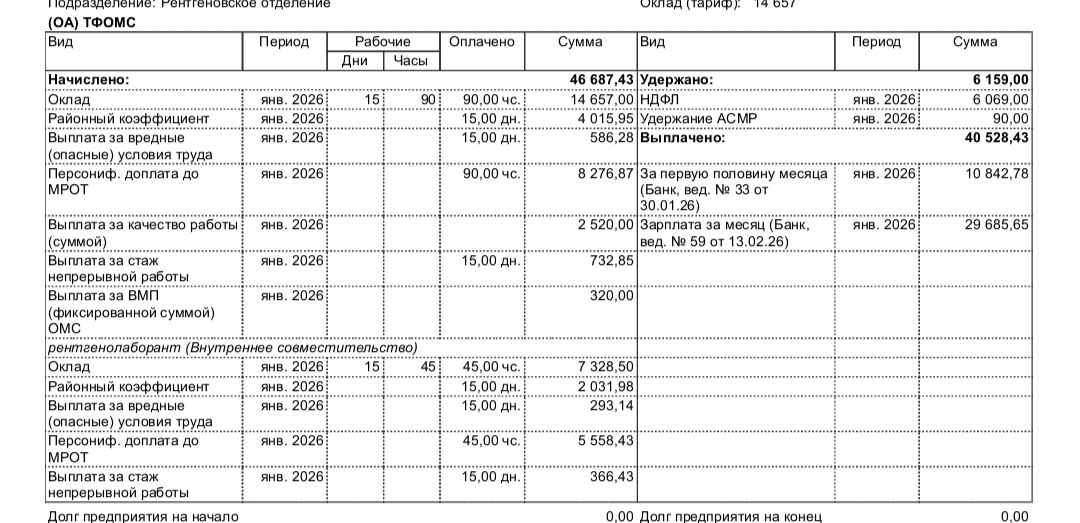 У меня сейчас расчётка выглядит до смешного маленькой, оклад, стажевые, вредность, ВМП. И с обязательной добавкой до МРОТ, на первую ставку 8 тысяч, на половину-4.