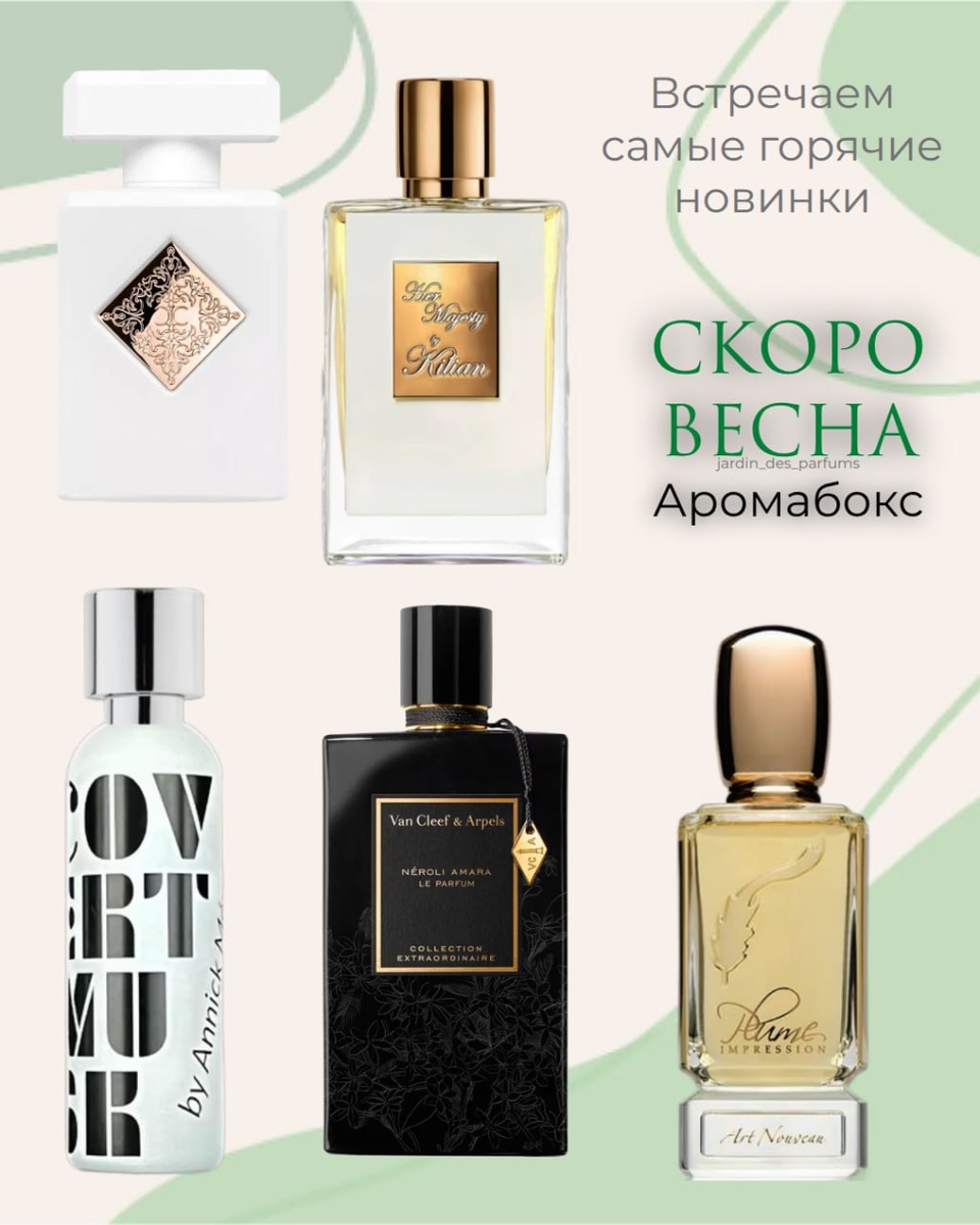 Самые горячие парфюмерные новинки! Сколько было ожиданий и все не напрасно. Т к я прекрасно понимаю, что ароматы могут разочаровать, также сильно, как и восхитить. И чтобы познакомиться с ароматами ближе, испытать всю силу их воздействия на окружающих, обольщения, способность заставить вас расцветать, словно после зимней спячки, не нужны полные флаконы по 100 мл, достаточно первого прикосновения длинную в 2-3 дня, которые обеспечат вам даже малыши отливанты в обьеме 1 мл. Я рада, что успеваю до своего отпуска презентовать вам новый аромабокс "Скоро весна". - Initio Lift Me Up - Plume Impression Art Nouveau - What We Do Is Secret Covert Musk - Van Cleef & Arpels Neroli Amara Le Parfum - Kilian Her Majesty Все новинки удачно собраны вместе, тк ни одна из них не похожа на другую, это крайне интересный ольфакторный опыт, и вы реально будете слышать "чем так вкусно пахнет?" "что на тебе за аромат?" тк они созданы для привлечения внимания, для того, чтобы вы могли расправить плечи и наслажда