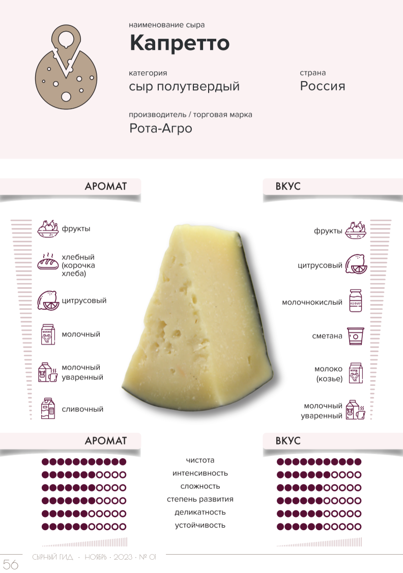 Полутвердые сыры для любителей попробовать что-то новое. Если надоели привычные сыры, то можно поэкспериментировать и найти нового фаворита. Вкусовой профиль сыра чистый, умеренно интенсивный. Доминирующие тона: фруктово-цитрусовые, с кислинкой. Нюансы: сметаны, козьего молока и молочного уваренного. Аромат сыра чистый, средней интенсивности, с доминированием фруктов, хлебной корочки / бриоши, цитрусовых и нюансами – молочным уваренным, сливочным. Подойдет для холодных и горячих блюда. Сыр с интересной яркой ароматикой, но с простым вкусом и послевкусием. Аромат сыра очень привлекательный – чистый, с интенсивностью выше умеренной, достаточно сложный и деликатный. Вкус сыра проще аромата с незначительным количеством нюансов, принадлежащих молочной группе ароматов – кефирный, сливочный и молочный уваренный. При этом вкус чистый, средней интенсивности. Отлично дополнит горячие и холодные блюда, а также бутерброды и закуски. Сыр с чистым и достаточно интенсивным ароматом. Доминируют – о