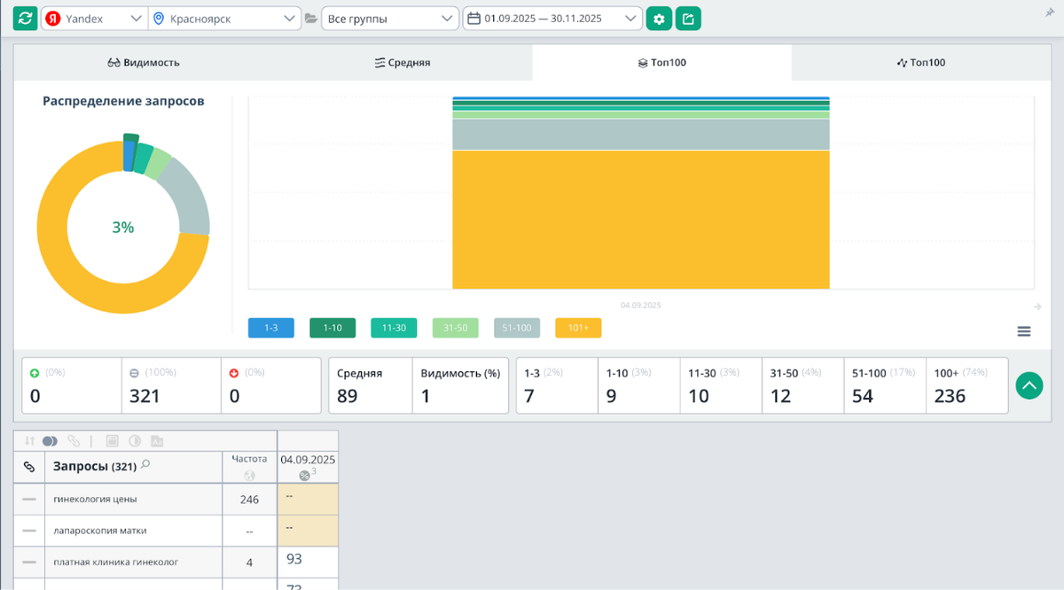 Все клиенты приходили в основном из офлайн каналов, а digital канал простаивал и не приносил трафика. Нашей задачей было привлечение целевого трафика на сайт и обеспечение приемлемой конверсии посетителей в клиенты. Клиника пришла на SEO продвижение сайта медицинских услуг в начале сентября 2025 года. На тот момент сайт невозможно было найти в поисковиках, посещаемость сайта была очень низкой и сайт никак не участвовал в расширении клиентской базы. Посмотрев наши кейсы SEO продвижения, заказчик решил обратиться к профессионалам с опытом продвижения сайтов медицинской тематики, чтобы получить результат - посещаемый сайт с высокими позициями по востребованным фразам, реальных посетителей, которые узнавали бы о клинике при посещении сайта. Первый