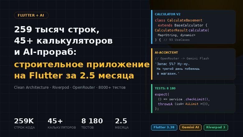 В этой статье расскажу про архитектуру, покажу реальный код и объясню, почему переписал систему калькуляторов с нуля на полпути разработки, как впихнул ИИ с характером ворчливого прораба через OpenRouter и зачем написал 8180 тестов на проект, который делает один человек. Статья: https://habr.com/ru/articles/1001080/ Платформа: кроссплатформа/Flutter 👨🦯➡️ AppFiles: код, инструменты, практики, производительность