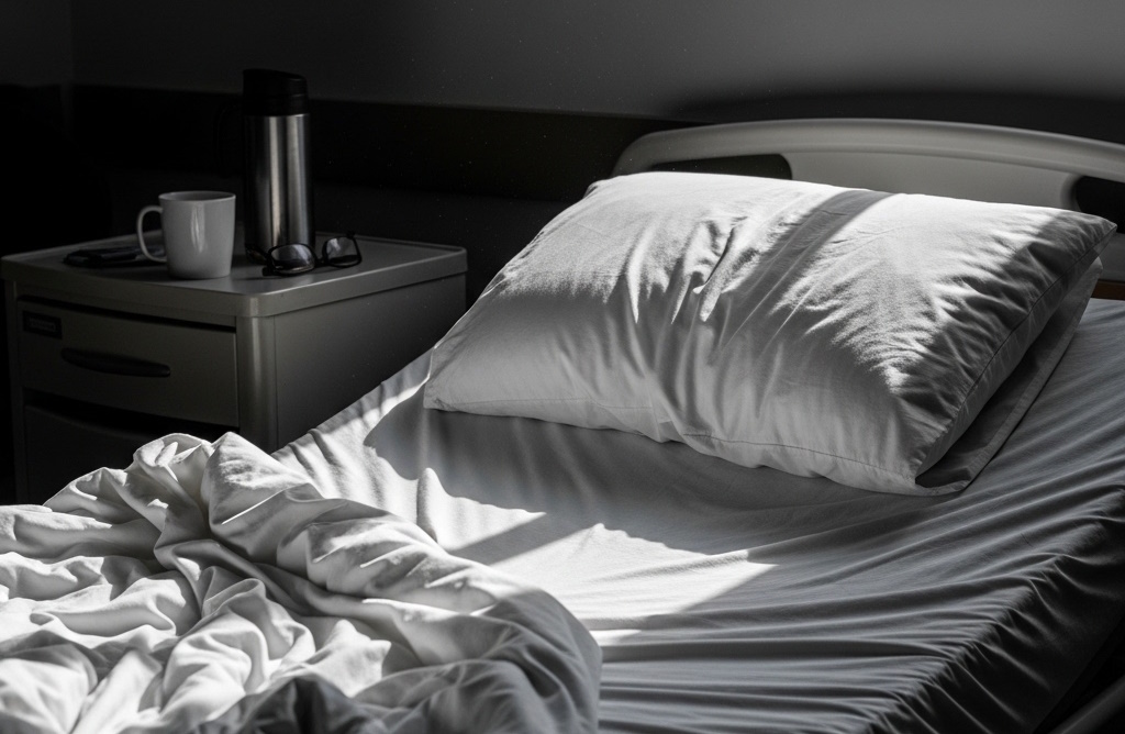 Палата — шесть коек. Четыре заняты. Тумбочки впритык. На ближней — пакет с печеньем, кружка, зарядка, привязанная к спинке кровати бинтом.