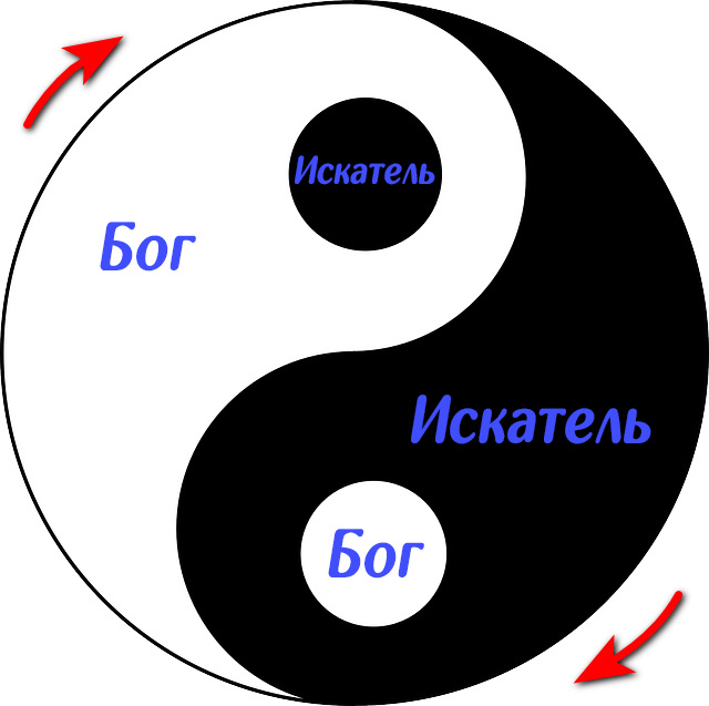 Почему духовный поиск никак не завершается? Учителя, медитации, сеансы, книги по эзотерике, бесконечные курсы и видео... Но почему каждый раз, когда кажется "Я нашёл Себя! Вот оно!", со временем всё равно возникает ощущение недостаточности "пробуждения" или "просветления" и желание продолжить поиск? Взгляните на картинку ниже. Духовный поиск похож на вращение символа Инь-Ян, где белая половинка - Истинное Я (Бог), а чёрная половинка - Ищущий. До тех пор, пока мы ищем ответы во внешнем: через книги, лекции, учителей, видео и т.п. - это бесконечные догонялки с Богом, вращение символа: Бог, проявленный через Искателя, ищет, но никак не может взглянуть на самого Себя. Одна половинка символа перетекает в другую, но не способна осознать себя целостным кругом. Однако, как видим, Бог присутствует как белый круг и внутри Искателя, можно сказать, в его сердце. Потому, чтобы наконец обрести Истинное Я (хотя именно "я" там как раз и нет, но для понимания так говорится) и перестать бегать по кру