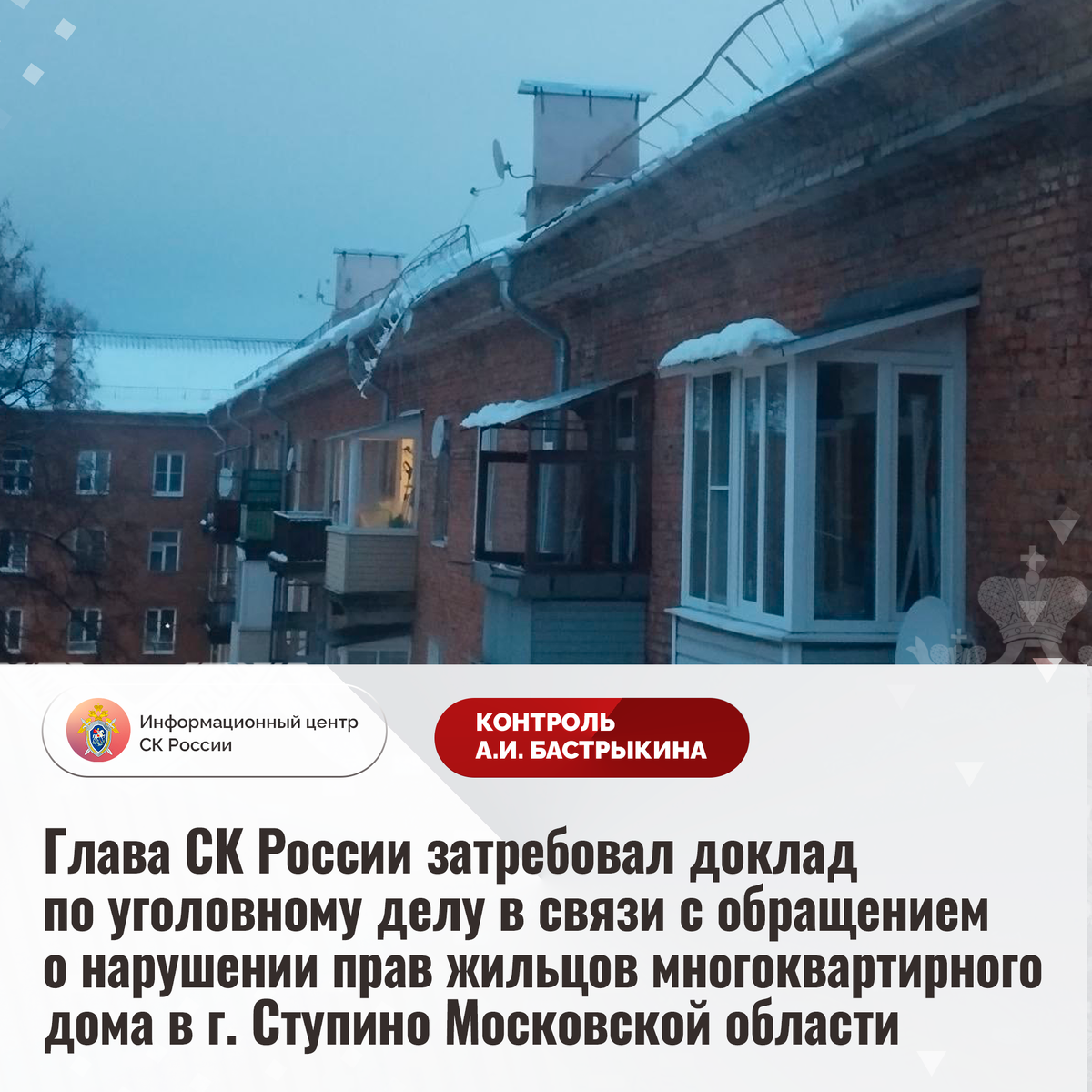 Глава СК России затребовал доклад по уголовному делу в связи с обращением о нарушении прав жильцов многоквартирного дома в г. Ступино Московской области В комментариях в аккаунте приёмной Председателя СК России А.И. Бастрыкина в социальной сети «ВКонтакте» размещено обращение по вопросу ненадлежащего обслуживания многоквартирного дома на улице Горького в городе Ступино Московской области. Несмотря на проведенный в 2019 - 2023 годах капитальный ремонт кровли здания 1955 года постройки, герметичность покрытия не обеспечена, ввиду чего происходят регулярные протечки. При этом конструкции крыши не укреплены, деревянные опоры разрушаются. Не обеспечена своевременная расчистка кровли от снега и наледи, что представляет опасность для граждан. Решение суда, обязывающее подрядную организацию, осуществлявшую ремонт крыши, устранить допущенные нарушения, не исполнено. Кроме того, в феврале текущего года в результате бездействия работников управляющей компании пострадала малолетняя после падения с