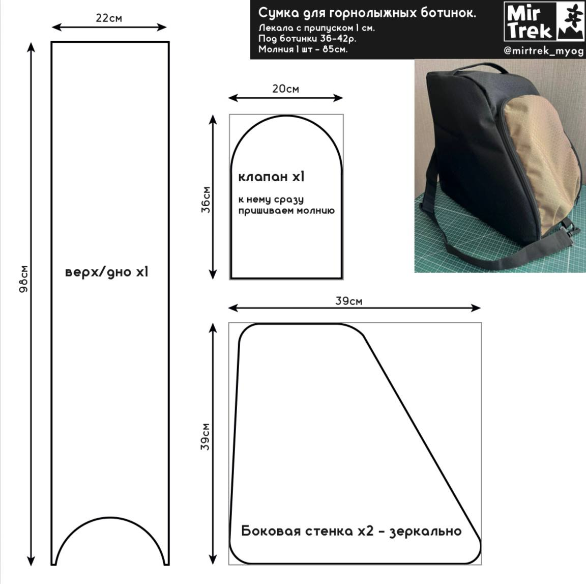 Вмещает пару горнолыжных ботинок 36-42 размера, каску и что-нибудь еще. С небольшими изменениями подойдет для обычных или роликовых коньков. В пошиве очень проста - пришиваете молнию к клапану, пришиваете ручку и крепления лямки к детали верх/дно, собираете эти детали в кольцо. Затем собираем боковые стенки к кольцу. Больше лекал в моем ТГ канале : https://t.me/mirtrek_myog или группе ВК : https://vk.com/mirtrek_myog