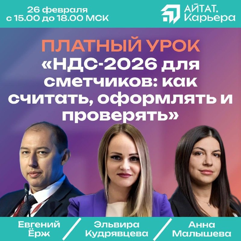 Остается одно — разобраться самим с лучшими экспертами Коллеги, давайте честно: с 1 января 2026 года в строительном сметном деле наступила очередная череда неопределенности. Основная ставка НДС выросла до 22%, а для УСН и пониженных ставок 5% и 7% изменились условия. 📣И здесь возникает главная проблема: единого пошагового регламента, как всё это учитывать в сметах и контрактах, не существует. Позиции экспертов могут отличаться. А это значит, что действовать по старым шаблонам больше не получится. Слишком много нюансов. ❓ Что делать с «переходящими» контрактами, заключенными в 2025-м со ставкой 20%? ❓ Как УСН-щику компенсировать «входящий» НДС 22%, если сам он платит 5%? ❓ Нужно ли перепроходить экспертизу, если смету утвердили со ставкой 20%, а торги пройдут в 2026-м? Приглашаем вас на практический урок, где мы разложим всё по полкам: «НДС-2026 для сметчиков: как считать, оформлять и проверять» 🗓 26 февраля (четверг) | 15:00 (мск) 💰 Стоимость: 4 500 руб. 👉 Регистрируйтесь п