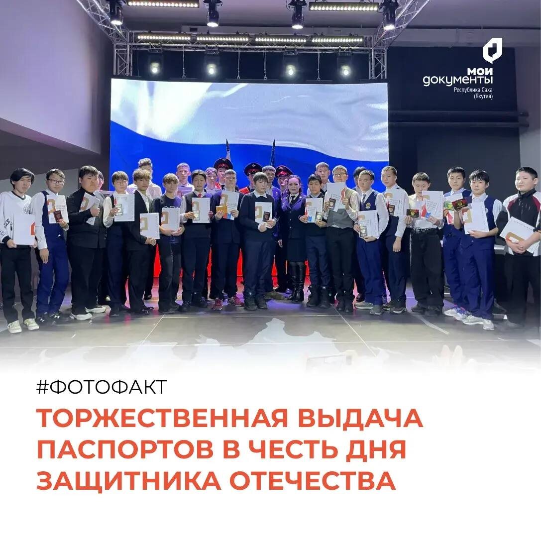 ❤️ ➡️19 февраля 2026 года в Молодёжном центре «Патриот» г. Якутска состоялась особенная церемония - вручение первых паспортов юным гражданам России. Поздравить ребят и лично вручить им документы пришли почётные гости: ➡️Начальник отдела по вопросам миграции МУ МВД России «Якутское», подполковник полиции Лилия Борисова; ➡️Герой Российской Федерации, первый заместитель генерального директора АНО «Учебно-стрелковый центр Сулус (Звезда) РС (Я)» Николай Евдокимов; ➡️Руководитель центра "Мои Документы" Таисия Никитина. Они поделились с новыми гражданами тёплыми напутствиями и подчеркнули важность этого этапа в жизни. 🎁Помимо основного документа, ребятам вручили памятные подарки и Конституцию РФ, чтобы знать свои права и обязанности. ✨Торжественные церемонии также пройдут в ряде отделений республики: Усть-Алданском, Олекминском и Ленском районах. Всего по Якутии в эти знаменательные дни документы получат 57 детей. Вручение первых паспортов в торжественной обстановке проводится центром