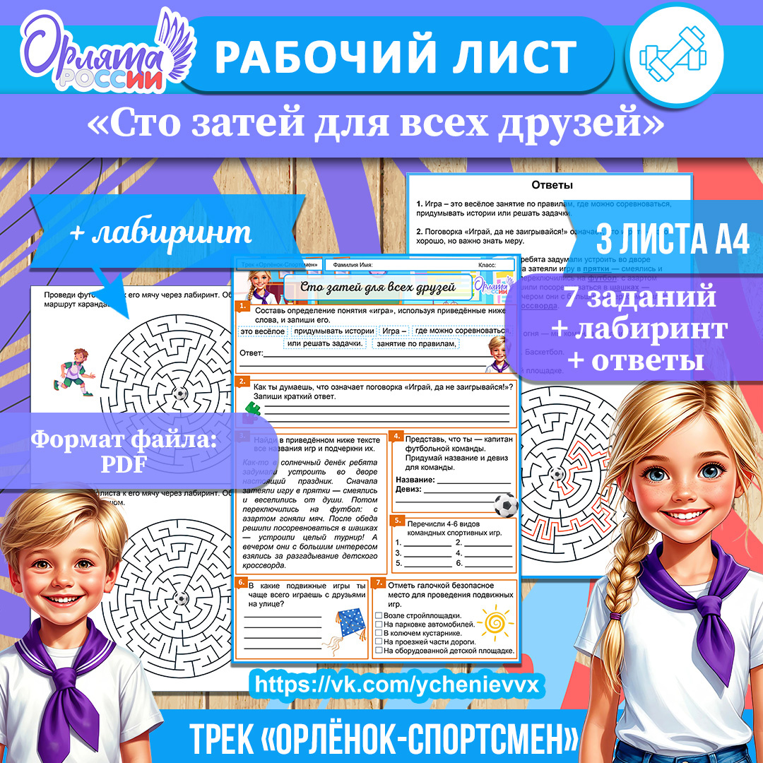 📄 Представляю вашему вниманию компактный трёхстраничный материал, который поможет заинтересовать детей темой спорта и игр: ✅ Страница 1: включает 7 разноплановых заданий, которые развивают логику, кругозор и командное мышление: ✅ Страница 2: два одинаковых увлекательных лабиринта — дополнительное игровое задание (удобно для компактной печати: оба лабиринта на одной странице). ✅ Страница 3: готовые ответы для учителя — экономия времени на проверку! Рабочий лист «Сто затей для всех друзей» представлен в PDF-формате. ❗ Этот материал (рабочий лист «Сто затей для всех друзей» + лабиринт + ответы) вы можете скачать тут.❗ --------------------------------------------