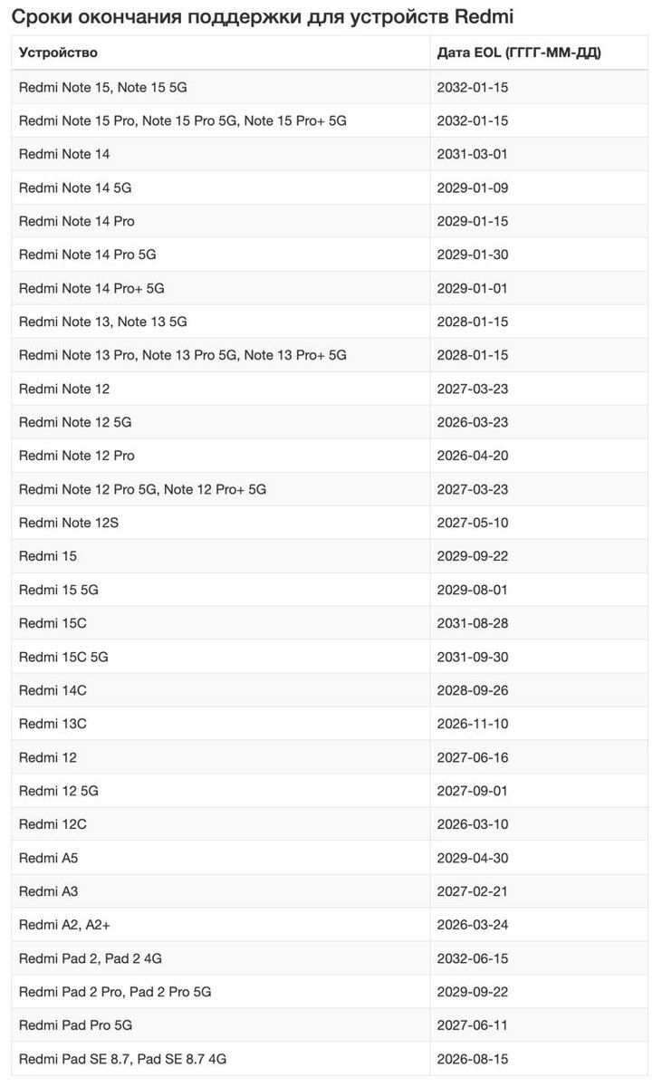 Для каждой модели определена дата окончания жизненного цикла (EOL), после которой выпуск любого программного обеспечения полностью прекращается. Что означает наступление даты EOL: — Полная остановка выпуска крупных обновлений операционной системы HyperOS; — Прекращение выхода регулярных патчей безопасности; — Отсутствие дальнейшей технической поддержки программного характера.