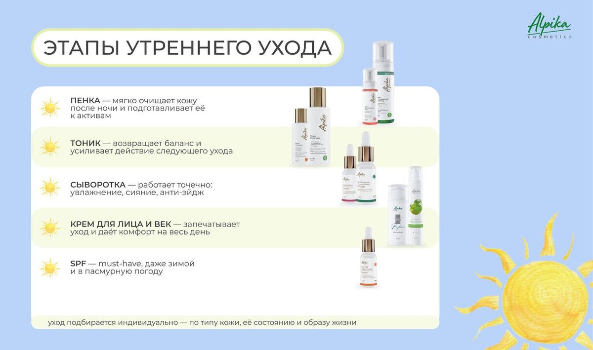 🥰 Именно утренний уход решает, будет ли кожа свежей и защищённой или уставшей уже к обеду Что должно быть в утренней косметичке у каждой девушки рассказали в нашем памятке от ALPIKA✨ ❗️Важно: нет универсального набора для всех Уход подбирается индивидуально — по типу кожи, её состоянию и образу жизни 👉🏼 Собери свой утренний уход на сайте alpika.ru — всё необходимое в одном месте, а если хочешь быть уверена на 100%, приходи на консультацию в офисы Альпика — её можно получить после уходовой процедуры 📍 Наши города: Санкт-Петербург, Москва, Ставрополь, Сочи, Краснодар, Ростов-на-Дону Начните утро правильно — и она ответит вам сиянием 💚