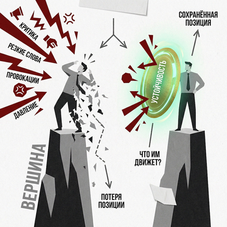 Даже когда ты на вершине. Разница в том, что происходит после того, как тебя зацепило. Тебе пишет незнакомый человек. Тон – как будто ты ему что-то должен. Запрос сформулирован так, что хочется спросить: «Ты вообще с кем разговариваешь?» Внутри – вспышка. Хочется ответить. Резко. По делу. И вот здесь – развилка. Ты можешь упасть с вершины за одну фразу. Очень легко. Эмоция толкает – ты отвечаешь – ты теряешь скорость. Позиции сдал. Профессионал на вершине делает иначе. Он останавливается. И задаёт себе вопрос: «Что им движет? Что он на самом деле хочет?» Это не про подавление эмоций. Это про устойчивость. Про то, чтобы тебя не раскачивало. Требуется оставаться профессионалом. Это просто необходимо. Потому что в противном случае – ты теряешь доступ к ресурсам которые позволяют находиться на вершине. Устойчивость – это один из ресурсов, без которого вершину не удержать. Это не про толстую кожу. Это про взгляд на критику, который позволяет не терять себя. Хочешь узнать что мешае