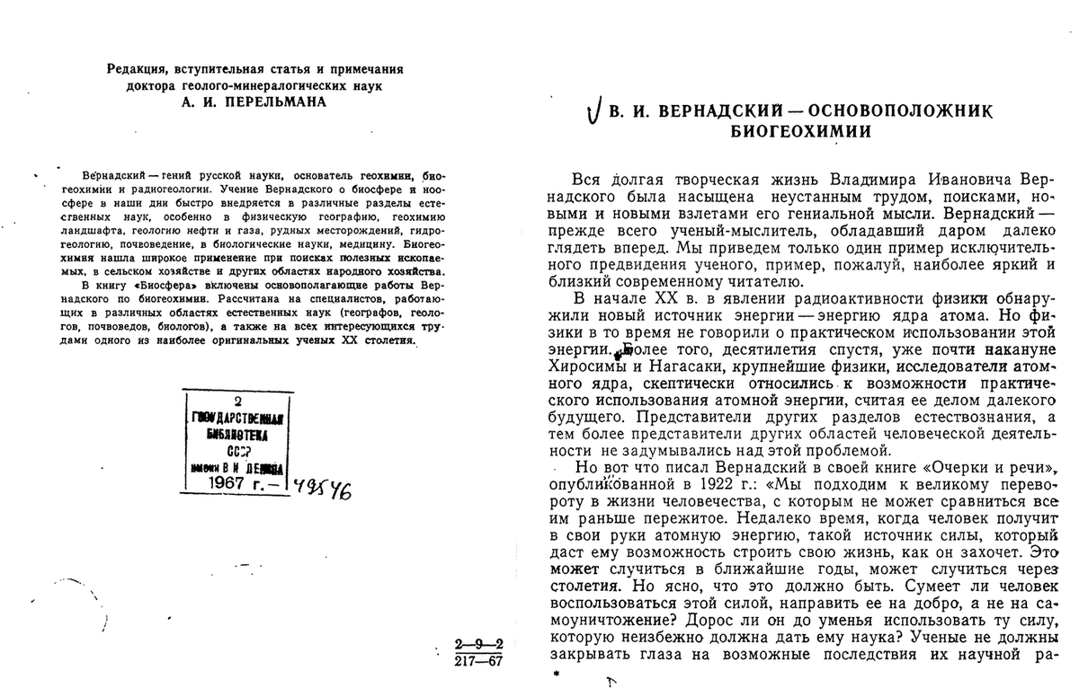 Две ключевые работы учёного-естествоиспытателя, основоположника геохимии и биогеохимии — «Биосфера» (1926) и «Научная мысль как планетное явление» (1938, опубл. посмертно) Эти работы и сформулированная концепция - стратегическая матрица для понимания вызовов антропоцена В.И. Вернадский изменил наше понимание планеты: биосфера - не фон для жизни, а её геологическая сила.