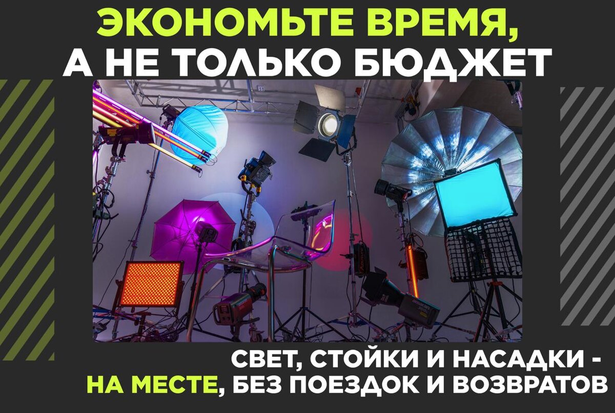 Организация съёмки это всегда десятки задач: локация, команда, техника, логистика. И чаще всего больше времени уходит именно на свет. Поездки в рентал, очереди, оформление, погрузка, возврат оборудования… Всё это съедает часы, которые можно было потратить на подготовку и саму съёмку. В нашей студии всё иначе. Свет уже здесь, ехать в рентал не нужно Всё необходимое уже находится в студии. Вы приезжаете и начинаете работать. Наша команда: ✅ подготовит и установит оборудование ✅ поможет с расстановкой света ✅ после съёмки самостоятельно демонтирует и уберёт технику. Вам не нужно тратить время на сборку, упаковку и возврат. Съёмка закончилась, вы просто уезжаете. Это выгоднее, чем рентал Средняя стоимость приборов в ренталах выше, чем в нашей студии. При этом у нас: ✅ стойки и насадки предоставляются бесплатно ✅ нет дополнительных платежей за каждую мелочь В ренталах за стойки, модификаторы и крепёж обычно платят отдельно. У нас всё включено в стоимость прибора. Экономия не только де