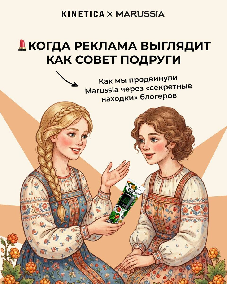 Marussia — бренд косметики для ухода. Продажи на Wildberries, переполненная ниша с десятками конкурентов. Прямая реклама крема для рук на маркетплейсе почти не работает, потому что аудитория к ней слепа. С чем работали: ✔️Рынок переполнен брендами кремов для рук ✔️Битва за внимание на Wildberries, десятки предложений в выдаче ✔️Прямая реклама не работает, аудитория игнорирует баннеры В мире бьюти люди не покупают «ещё один крем». Они покупают то, что посоветовала девушка из соц. сетей, которой доверяют (ну или которая убедительно рассказывает). 💄Как рассуждали: личный опыт блогера = доверие + импульсивная покупка. Отказались от классической рекламы и сделали ставку на нативные посевы — когда блогеры делятся «секретной находкой с Wildberries», а не рекламируют продукт. Что сделали: ✔️Отобрали каналы не по охвату, а по вовлечённости и тематическому совпадению с ЦА бренда — это принципиально другой фильтр, который отсеивает 70% «красивых» каналов с мёртвой аудиторией. Не «женская