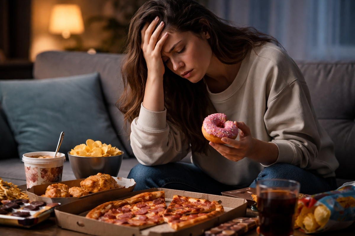 Кроме того, еда действительно снижает уровень тревожности за счёт активации дофаминовых и серотониновых путей. Человек начинает использовать пищу как быстрый способ саморегуляции, и постепенно формируется устойчивая связь «напряжение — еда — облегчение».