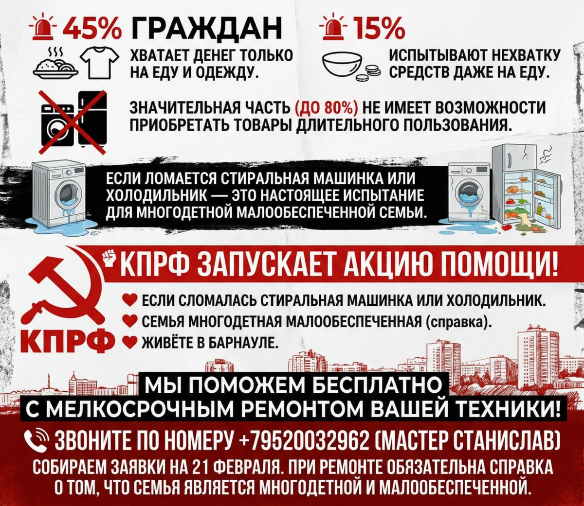 🚨 Около 45% граждан хватает денег только на еду и одежду. 🚨 Около 15% испытывают нехватку средств даже на еду. 🚨 Значительная часть населения (по некоторым подсчётам до 80%) не имеет возможности приобретать товары длительного пользования. В таких условиях, если в многодетной малообеспеченной семье ломается стиральная машинка или холодильник это становится настоящим испытанием. ✊КПРФ запускает акцию помощи оказавшимся в такой трудной жизненной ситуации. ❤️ Если в вашей семье сломалась стиральная машинка или холодильник. ❤️ При этом ваша семья является многодетной малообеспеченной и вы можете подтвердить это справкой. ❤️ Вы живёте в Барнауле. Мы поможем вам бесплатно с мелкосрочным ремонтом вашей техники! 📞Звоните по номеру +79520032962 (мастер Станислав) Собираем заявки на 21 февраля. При ремонте обязательна справка о том, что семья является многодетной и малообеспеченной.