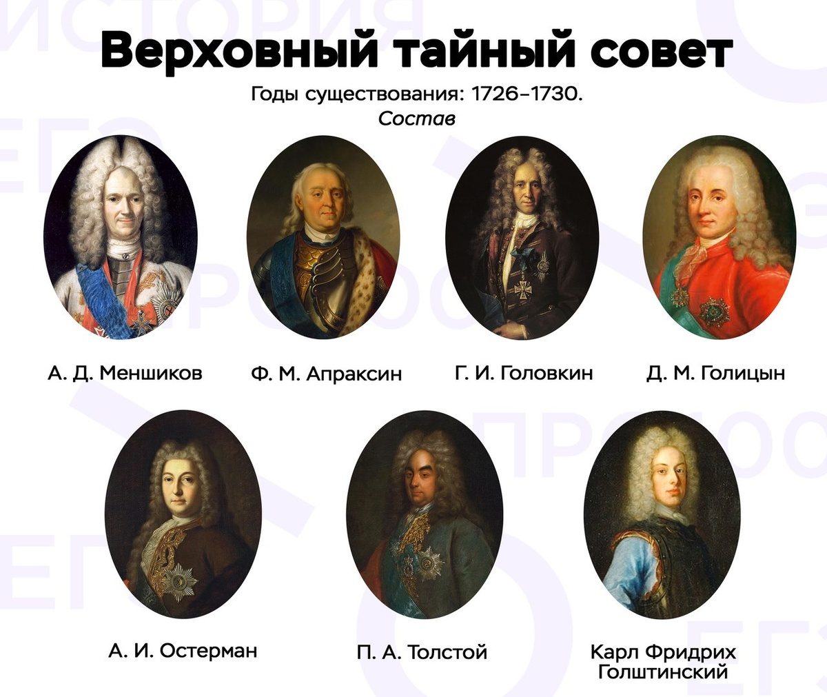 государственными внутренними и внешними делами России. После смерти императора Петра I в 1725 году на престол взошла его супруга Екатерина Алексеевна, создавшая из числа сподвижников покойного императора Верховный тайный совет, который должен был советовать государыне, как следует поступить при принятии государственных решений. Совету были подчинены коллегии, а роль Сената сократилась, что выразилось, в частности, в переименовании его из "Правительствующего сената" в "Высокий сенат". В первый состав Тайного совета входило семь человек: А. Д. Меншиков, Ф. М. Апраксин, Г. И. Головкин, П. А. Толстой, А. И. Остерман, Д. М. Голицын и зять императрицы герцог Карл Голштинский.