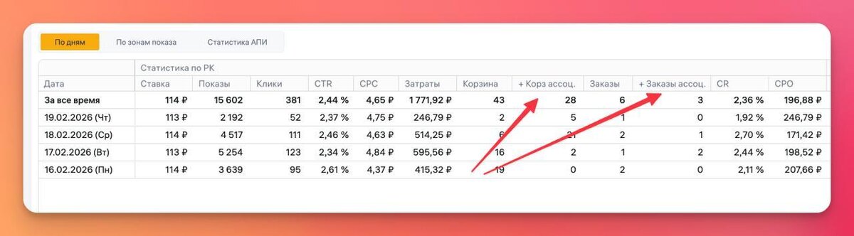 В разделе статистика по дням начали выводить отдельно корзины и заказы по рекламируемому товару и отдельно ассоциированные конверсии
