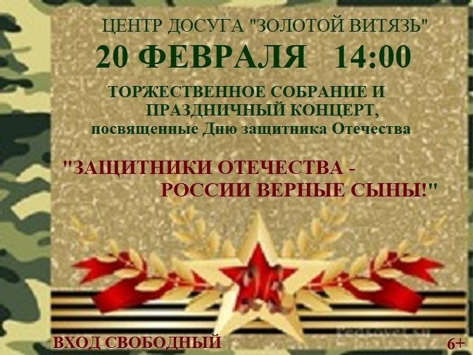 20 февраля в 14:00 в Центре досуга «Золотой витязь» пройдет торжественное собрание и праздничный концерт, посвященные Дню защитника