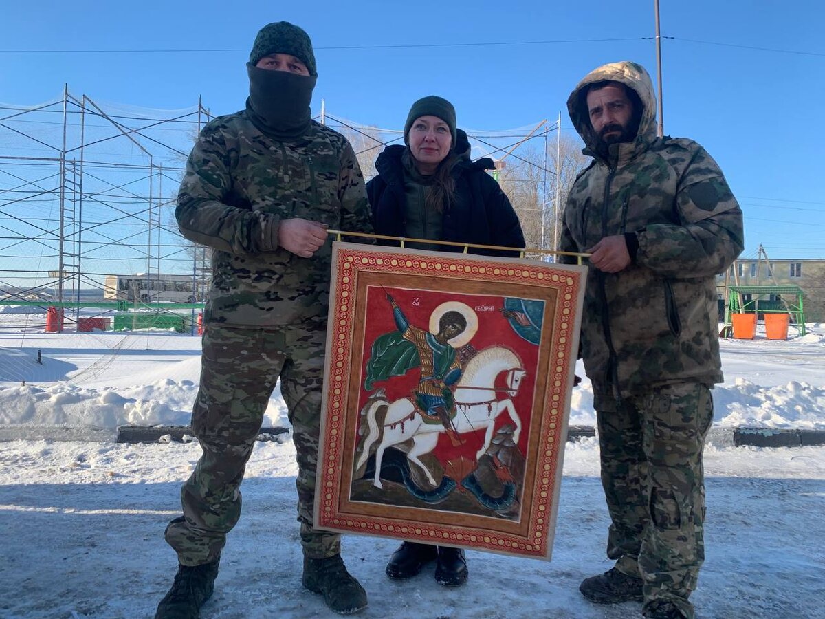 » В ноябре 2025 года на наших интернет-страницах мы писали об учащихся Иконописной мастерской подворья, изготовивших для воинов – участников специальной военной операции хоругвь с ликом святого великомученика Георгия Победоносца. На днях руководитель регионального объединения Союза Ветеранов Боевых Действий «Отчизна» Санкт-Петербурга волонтерского объединения «Феникс-Нева» Елена Анатольевна Егорова передала священное боевое знамя бойцам подразделения «Скиф» 204-го Полка СпН «Ахмат».