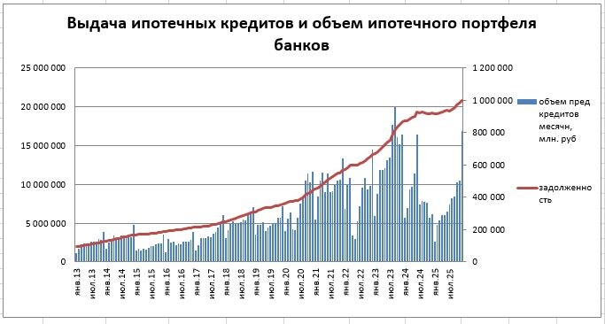 Что происходит с главной движущей силой российского рынка недвижимости – ипотекой? – давайте смотреть статистику за 2025 год. Попробуем формат «картинки – комментарии». После провала второй половины 2024 – начала 2025 положение застройщиков стало угрожающим. Выдачи ипотеки откатились на уровни пятилетней давности, что было совершенно недостаточно даже «для поддержки штанов». Но как это уже неоднократно наблюдалось ранее (например, в 2020, в 2022 году), спад не оказался слишком долговременным. К концу 2025 года объем выдач фактически вернулся к рекордам прошлых лет (более 800 млрд. руб. за декабрь). Драйвером стали анонсы ужесточения условий по семейной ипотеки (прием «хватай, пока не поздно», ранее использовавшийся неоднократно). Естественно, на фоне все еще высокой ставки ЦБ такой результат мог быть достигнут только за счет активизации льготной ипотеки по нерыночным ставкам. Доля «льготки» на сократилась, а так и осталась на уровне 80% от всех ипотечных кредитов. Фактически, ни о како