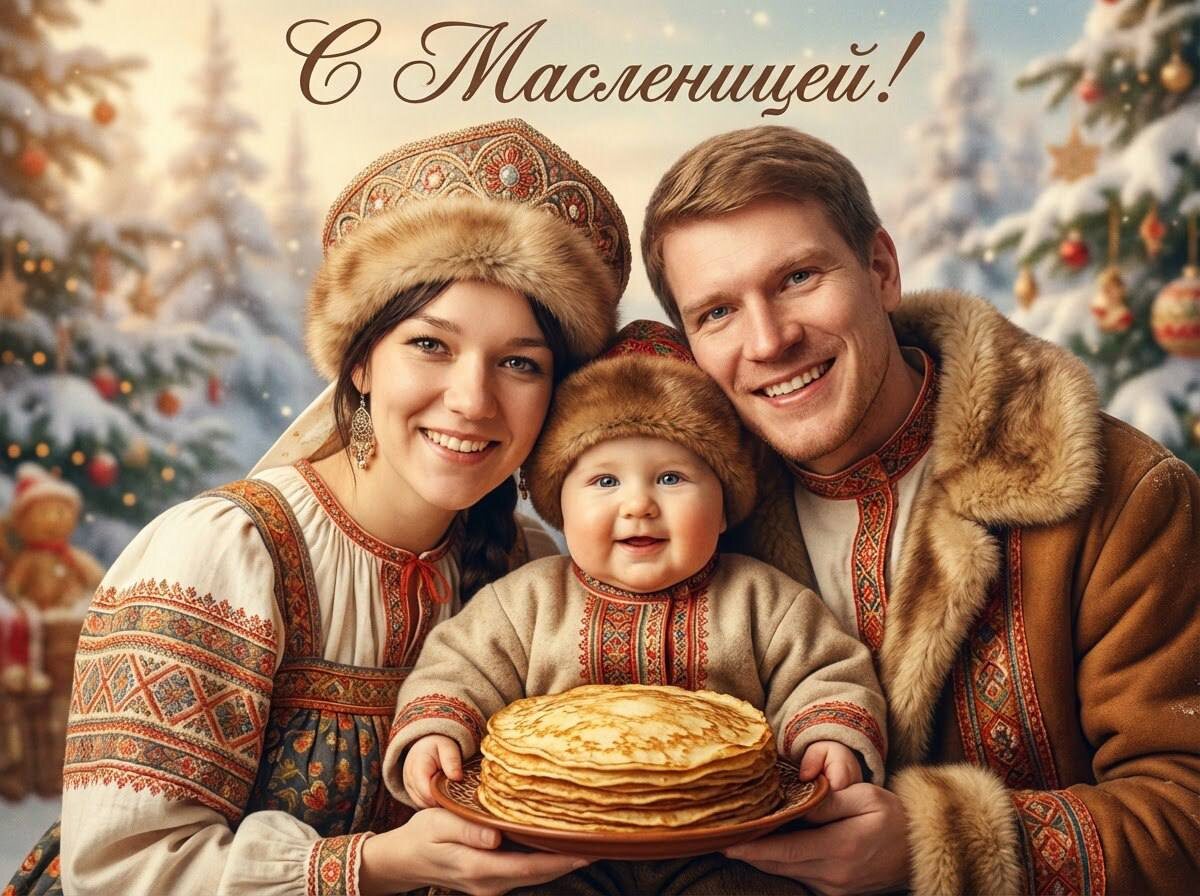 ✨ Промт ⬇️ Сохрани внешность без изменений. Экстремально крупный, близкий портрет. Лицо полностью узнаваемое, фотореалистичные, естественные. Тёплая семейная композиция: по бокам взрослые, в центре дети (ребёнок). Лица близко друг к другу, лёгкие естественные улыбки, ощущение уюта и праздника. Полностью замени одежду и обувь на традиционные русские праздничные наряды в стиле Масленицы: светлые народные костюмы с вышивкой и меховыми элементами. Женщины в кокошниках, подобранных по полу и возрасту. Фон: мягкий зимний сказочный пейзаж, снег, праздничная атмосфера. В руках центрального персонажа (преимущественно ребёнка) тарелка со стопкой румяных блинов. Над изображением винтажная надпись: «С Масленицей!» Цвета: мягкие тёплые оттенки, уютный свет, винтажная открытка, атмосферно, празднично, фотореализм. 🤖 Попробовать