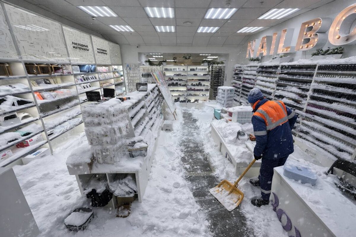 🥶 В Москве сегодня такой снегопад, что нам пришлось расчищать дорожки… прямо в павильоне