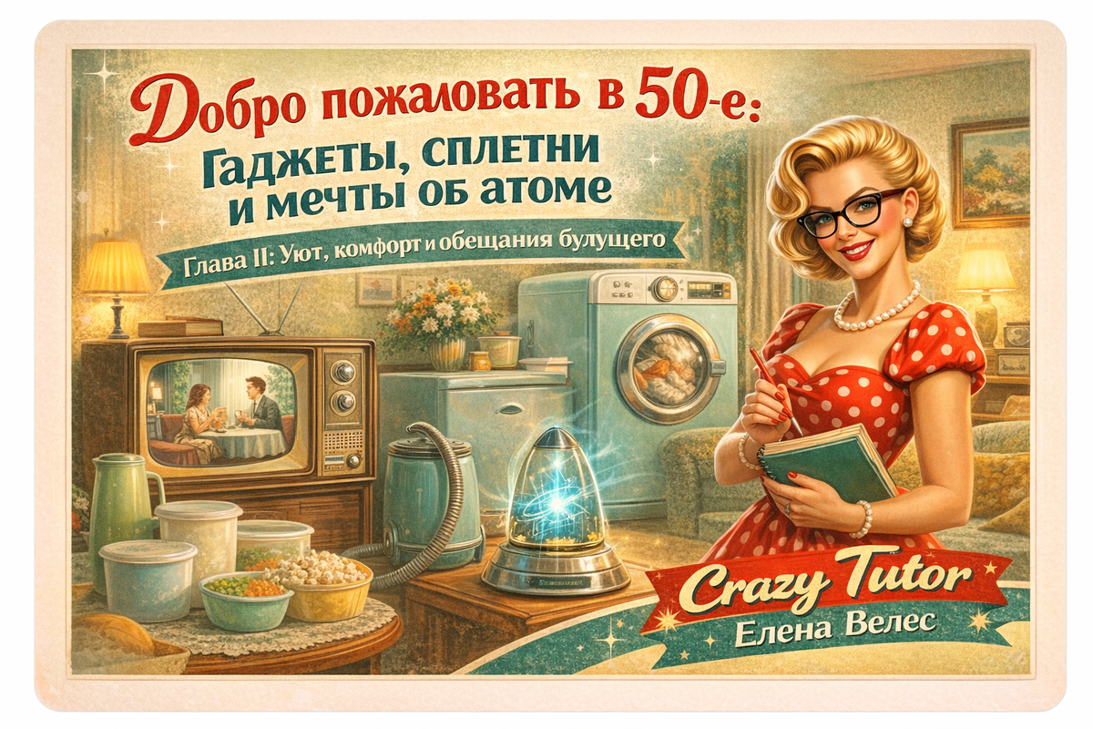 Ну что, мои бесстрашные time-travelers, вторая часть нашего погружения подошла к концу! Мы увидели, как телевизор захватил гостиную, а «мирный атом» едва не пробрался в наш холодильник. Мы научились продавать пластик на вечеринках и почти поверили в «атомное» будущее.