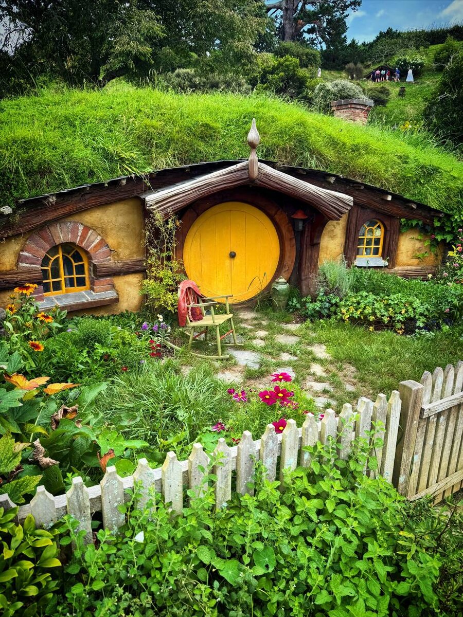 Думаю, не ошибусь, если скажу, что главная и самая посещаемая достопримечательность Северного острова Новой Зеландии – это Хоббитон. Именно здесь снимались сцены из фильмов по произведениям Толкин – «Властелин колец» и «Хоббит». Здесь можно увидеть 44 уютные норы хоббитов, знаменитый дом Бильбо, мельницу и мост через пруд. В 1998 году режиссер Питер Джексон искал идеальную локацию для съемок. Облетая остров на вертолете, он заметил холмистую овечью ферму семьи Александер. Пейзаж идеально подходил для Шира – зеленые холмы, пруд, уединенность. Подписывайтесь на Telegram-канал Никиты Непряхина. Для «Властелина колец» декорации были временными. После съемок большую часть конструкций разобрали, оставив лишь фасады. А вот когда началась работа над трилогией «Хоббит», декорации решили восстановить, но уже на постоянной основе. Вот так сначала частная ферма стала декорацией для фильма, а потом и вовсе одной из главных достопримечательностей страны. Впечатляет, что каждая деталь здесь продумана