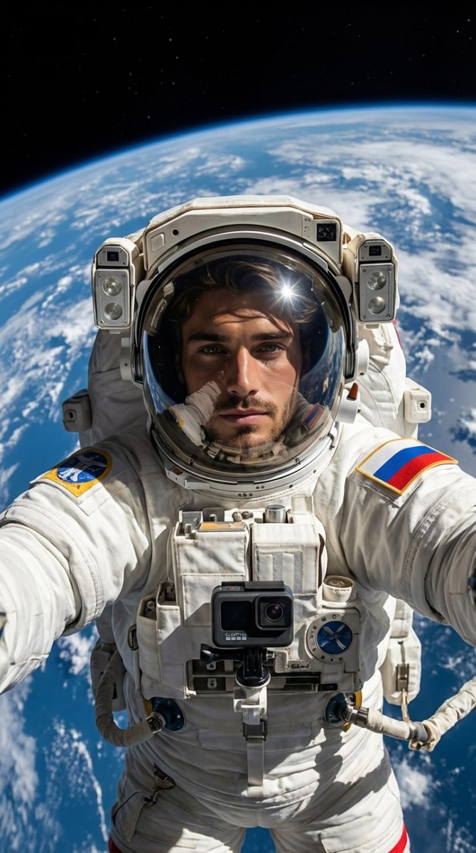 😉 «А где сами промпты из подборки?» Исправляемся и делимся ими в этом посте и следующем. Забирайте в копилку идей и вдохновения✨ Переходи в: https://t.me/marketplacevideoai_bot и создавай! Нажимай "Меню", "Главное меню", выбирай "Работа с фото", "Pro режим", далее "Редактировать фото", загружай своё изображение и копируй промпт. А ещё проще ты можешь сделать это прямо на сайте 👉 https://marketvideo.ru/ (звезды на сайте и в боте разные) Промпт в космосе: Фотореалистичное селфи человека с сохранением внешности и черт лица с исходного фото, в стиле GoPro. Человек в белом детализированном скафандре астронавта с российским флагом на плече, находится рядом с Международной космической станцией на орбите Земли. На заднем плане видна изогнутая поверхность Земли с океанами и облаками, чернота космоса, звёзды. Лицо внутри шлема естественно затемнено мягким теневым эффектом от стекла шлема, чтобы выглядело реалистично, без потери выражения лица. Яркое солнечное освещение создаёт отражения