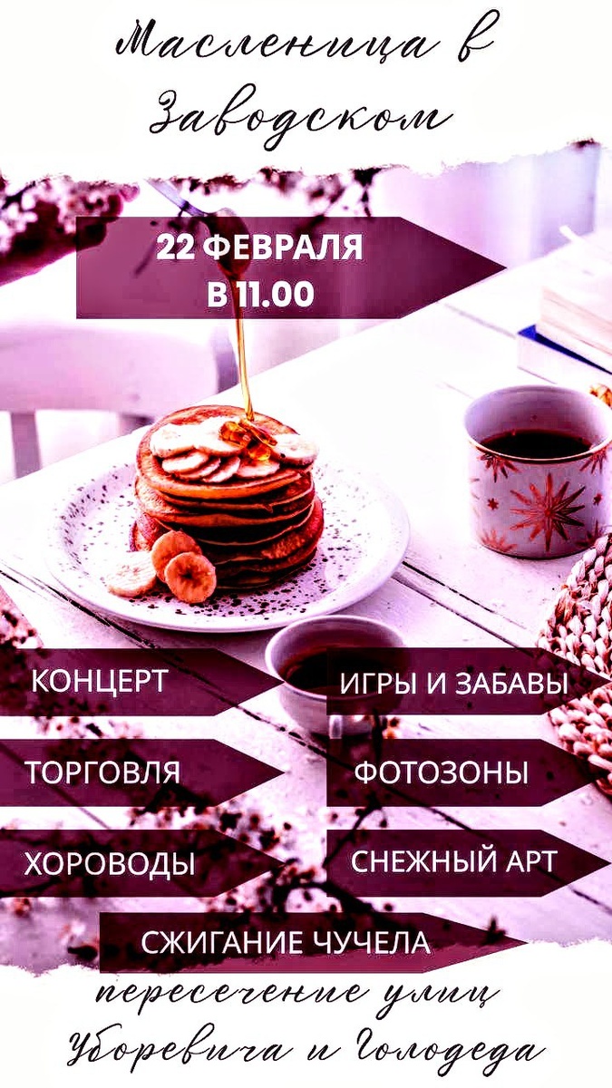 ! 🎉 Приглашаем вас отпраздновать Масленицу в Заводском! 🧁🥞 Вас ждёт концертная программа, игры, забавы, сжигание чучела зимы и, конечно, море веселья! 🥳✨ 🗓 22 февраля в 11:00 🟥 пересечение улиц Уборевича и Голодеда Приходите, будет очень интересно и весело! 🤗 Приходите и окунитесь в атмосферу праздника! 🌞🎪 Присоединяйтесь к нам, чтобы вместе встретить весну! 🌼🌷