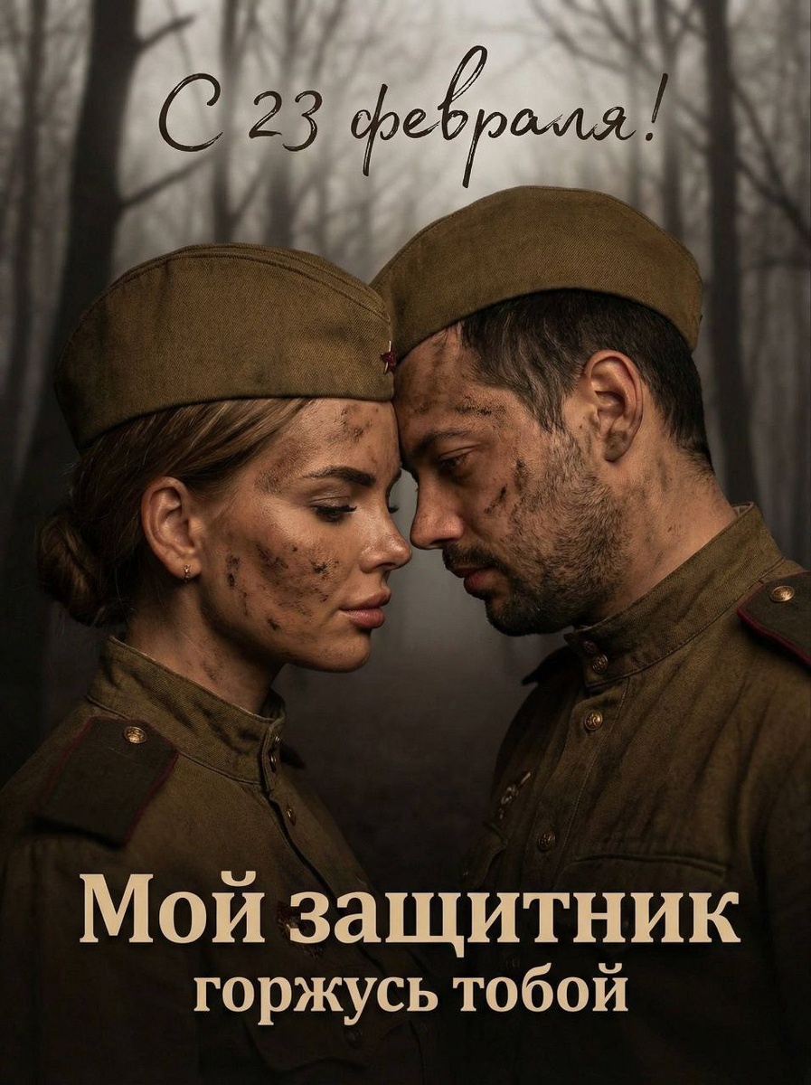 ! 💪 👋🔘 Как сделать такое фото? 1️⃣. Переходи в нашего бота: @aivizbot 2️⃣. Прикрепи два фото ( женщина и мужчина ) — Загрузи свою фотографии, где чётко видно лица — Нажми Отправить 3️⃣. Нажми "Открыть редактор" — В открывшемся приложении выбери nano banana — Режим pro — Введите промт (текст ниже) — Нажми Отправить 🤩 Промт кадр 1 (скопируй одним касанием): Создай не меняя черты лиц.На изображении пара, стоящая на фоне разрушенного города. В кадре только лица Мужчины и женщины в военной форме времен Великой Отечественной войны, с пилотки на головах, выглядят эмоционально вовлечёнными в момент. Они близки друг к другу, их лица почти касаются, между ними создается интимная атмосфера. У обоих на лицах заметные следы грязи и пыли, что подчеркивает трудности военных лет и их участие в борьбе. Женщина смотрит на мужчину,касаясь нежно правой рукой щеки мужчины, а мужчина чуть наклонил голову, их взгляды направлены друг на друга в момент единения. Надпись прописью на фото сверху: «С 23