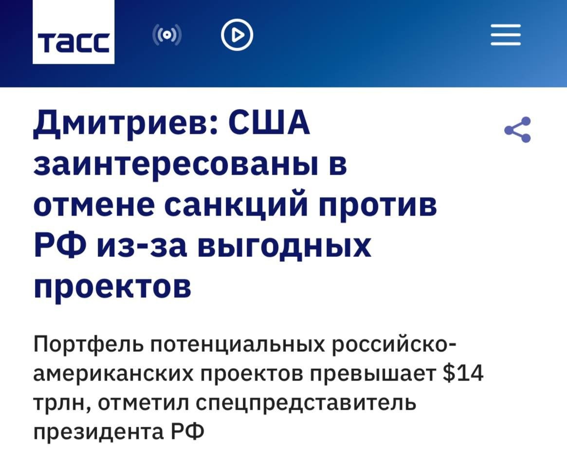 США отменят санкции против России из-за потенциальных совместных проектов на $14 трлн, а также из-за крупных убытков американских компаний, заявил спецпредставитель Кирилл Дмитриев.