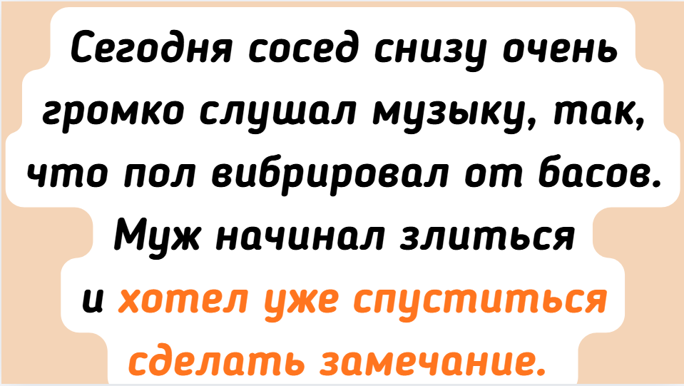 - Сегодня сосед снизу очень громко слушал музыку, так, что пол вибрировал от басов. Муж начинал злиться и хотел уже спуститься сделать замечание. Но тут я решила действовать иначе. На листе бумаги написала: «Мишка, нам телевизор не слышно :)» И, опустив швабру, постучала табличкой ему в окно. Музыка тут же стихла. Представляю, каково было удивление соседа, когда он услышал стук в окно 8 этажа.